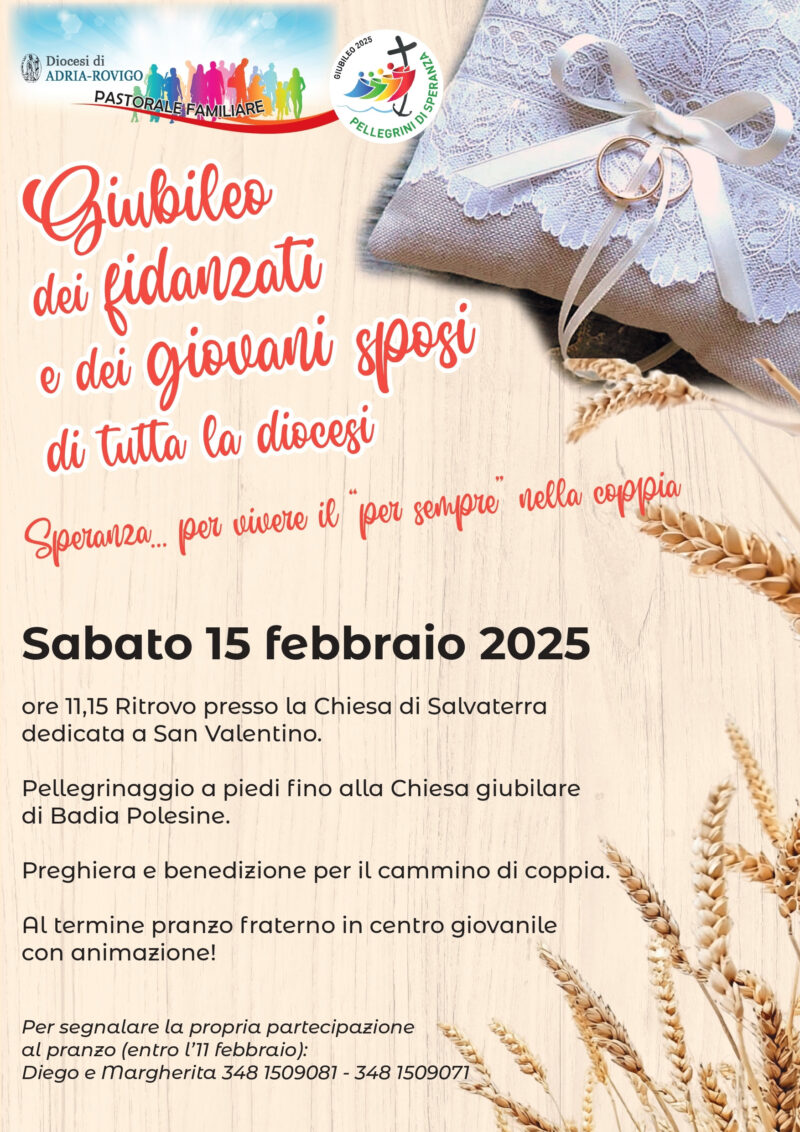 In questo Anno Santo la Pastorale familiare diocesana ha pensato ad alcune iniziative da vivere nel nostro territorio. La prima è il Giubileo dei fidanzati e giovani sposi con “Speranza per vivere il ‘per sempre’ nella coppia”. L’appuntamento mento è sabato 15 febbraio con ritrovo alle 11.15 presso la chiesa di Salvaterra dedicata a San Valentino. Da lì si partirà in cammino verso la chiesa giubilare di Badia Polesine, dove i partecipanti riceveranno la benedizione; a seguire il pranzo comunitario in centro parrocchiale. Adesioni entro l’11 febbraio al 3481509081 – 3481509071.