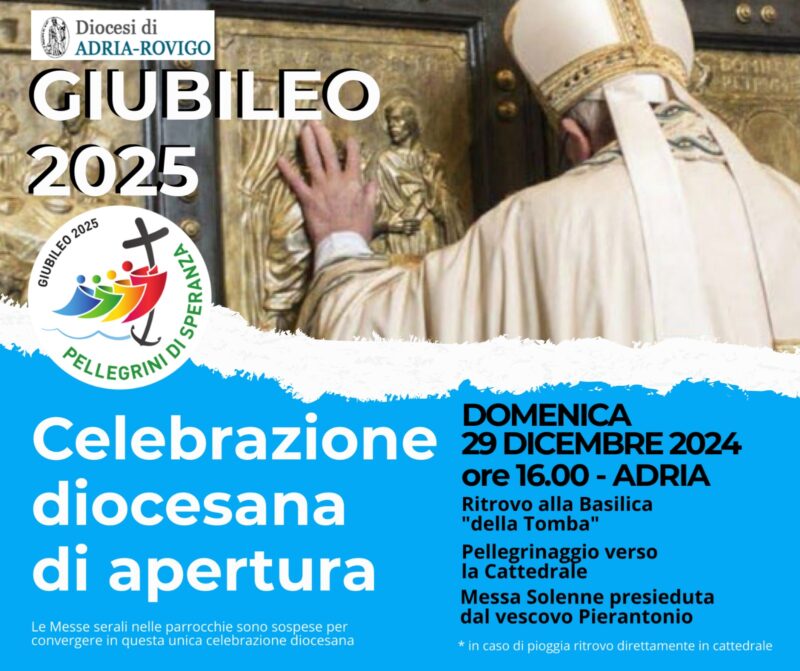Domenica 29 dicembre il Vescovo presiederà l’apertura diocesana del Giubileo in Adria: la celebrazione avrà inizio presso la Basilica di Santa Maria Assunta della Tomba alle 16, dove si farà memoria del battesimo attorno all’antica vasca battesimale; ci si recherà poi in processione alla Chiesa Cattedrale dove vi sarà la solenne concelebrazione eucaristica.