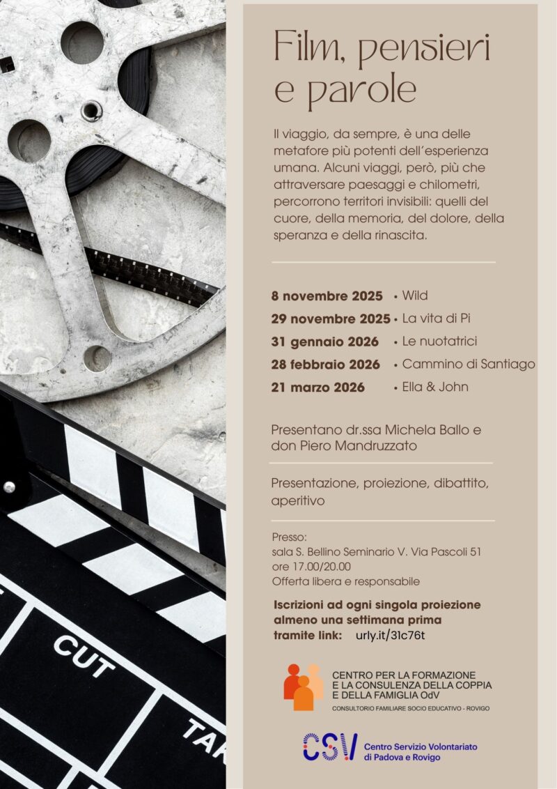 Il Consultorio familiare socio-educativo di Rovigo in collaborazione con il Centro Servizi per il volontariato propone un ciclo di proiezioni dal titolo “Film, pensieri e parole”: il viaggio, da sempre, è una delle metafore più potenti dell’esperienza umana. Alcuni viaggi, però, più che attraversare paesaggi e chilometri, percorrono territori invisibili, quelli del cuore, della memoria, del dolore, della speranza e della rinascita.