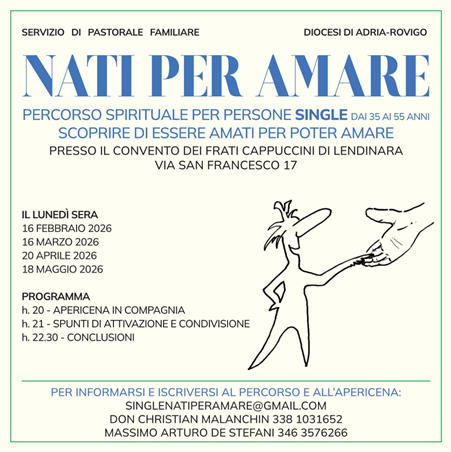 La diocesi di Adria-Rovigo con il servizio di pastorale familiare organizza un percorso spirituale per persone single dai 35 ai 55 anni, scoprire di essere amati per poter amare.