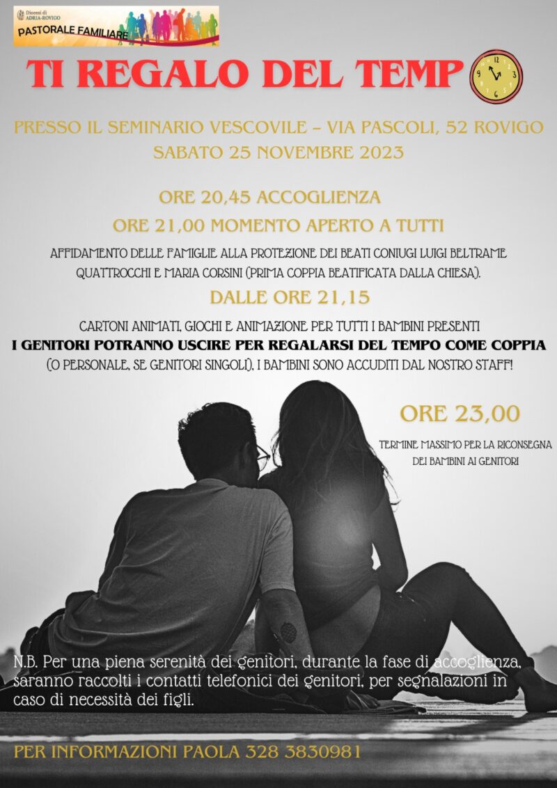 Lo faremo sabato 25 novembre alle 21, in seminario a Rovigo. Quest’anno desideriamo anche fare un regalo a tutti i genitori che hanno figli: un po’ di tempo per la propria coppia o per sé stessi. Come equipe della pastorale familiare diocesana ci impegniamo dalle 21,15 a prenderci cura dei loro figli in modo che possano donarsi del tempo libero quella sera. Mentre i genitori usciranno, i bambini vivranno un tempo di animazione con cartoni animati e giochi fino alle ore 23.